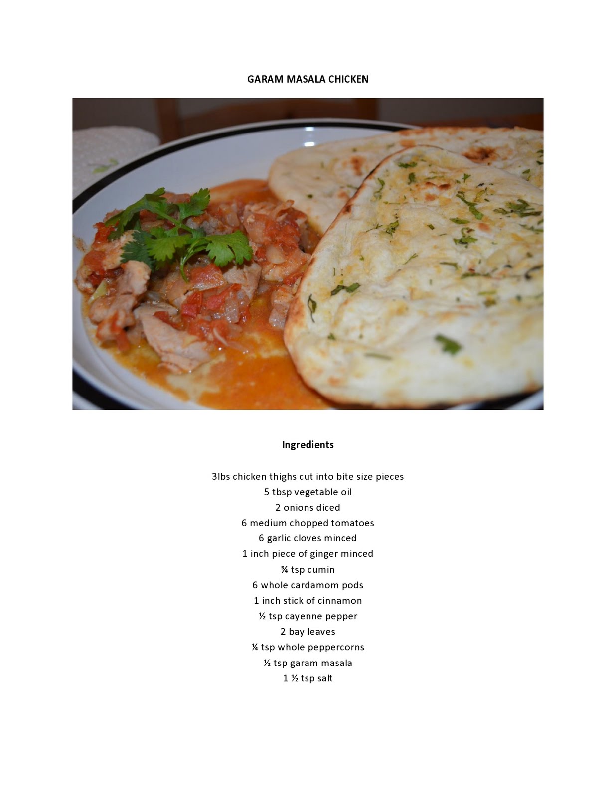 So, I've definitely blogged about this dish in my last blog, but I wanted to post it again because I really wanted to be able to reference it here since I deleted my other blogs. So, my friend, Jason actually gave us his mom's recipe for this amazing chicken. I had never tried anything with garam masala in it, but now I really want to find more recipes with it. It not only has great flavor, but actually thickens sauces really quickly. I accompanied this chicken with store bought garlic naan from Trader Joe's, which I highly recommend. This dish has so much flavor and the perfect amount of spice.